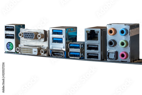 Obraz premium Ports on the back of the motherboard isolated on white background