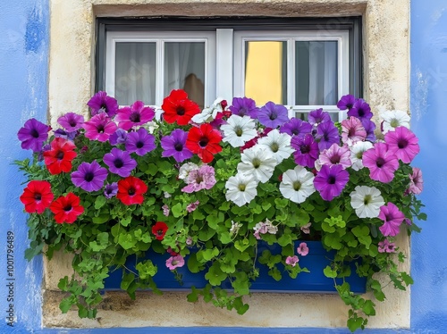 Naklejka premium Portugal, Costa Nova. Petunia flowers in a flower box on top of a striped...