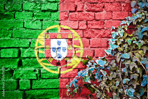Fototapeta premium Portugal grunge flag on brick wall with ivy plant