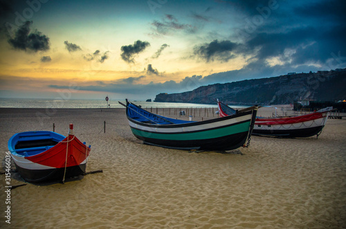© Aliaksandr, Fototapeta premium Portugal, Nazare beach, colored wooden boats, panoramic view of Nazare Town, Traditional Portuguese fishing boats in Nazare on the coast, blue clouds on the sky, white sand of beaches of Portugal