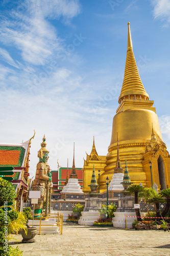 © tisomboon, Naklejka premium Posąg strażnika demona z Wielką Złotą Stupą w Wat Phra Kaew na tle nieba, Świątynia Szmaragdowego Buddy Wat Phra Kaew to jedno z najbardziej znanych miejsc w Bangkoku w Tajlandii