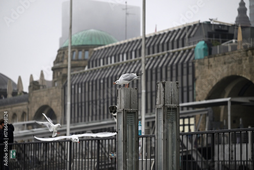 Obraz premium Posing Seagull at Hamburg Harbor on a foggy day. Showing and presenting....