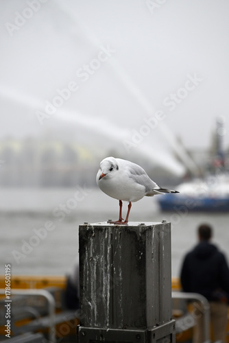Obraz premium Posing Seagull at Hamburg Harbor on a foggy day. Showing and presenting....