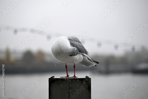 Naklejka premium Posing Seagull at Hamburg Harbor on a foggy day. Showing and presenting....