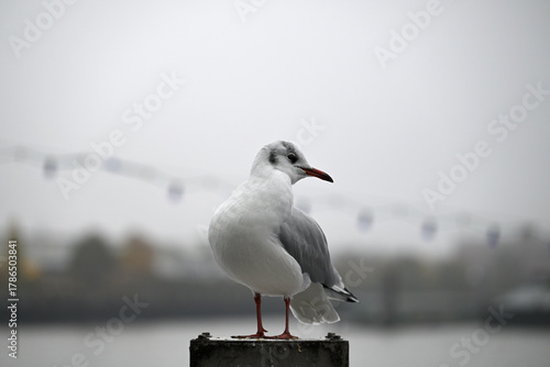 Obraz premium Posing Seagull at Hamburg Harbor on a foggy day. Showing and presenting....