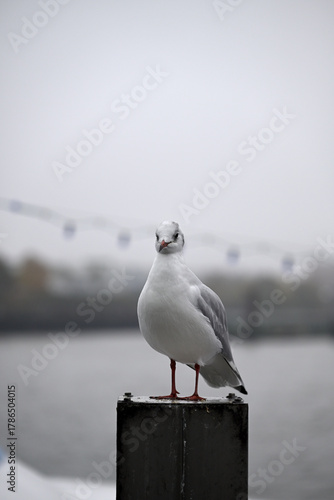 Obraz premium Posing Seagull at Hamburg Harbor on a foggy day. Showing and presenting....