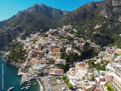 © DVS - Drone Visuals, Naklejka premium Positano is a seaside town in the southern Italian region of Campania in the province of Salerno. It is the westernmost point of the famous Amalfitana, which is known worldwide for its natural beauty.