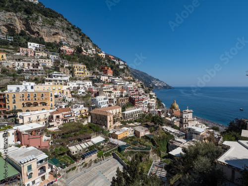 Obraz premium Positano Village. Beautiful morning scenery. Summer vacation in Italy. Beautiful Campania.A sunny day in Positano. The best beaches of Italy. April, 2019