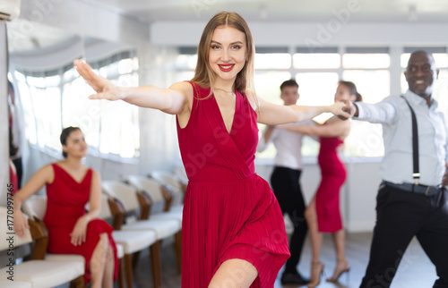 Obraz premium Positive adult woman in vibrant red dress enjoying active dances with black...