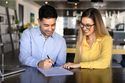 Fototapeta premium Positive business expert woman pointing at place for signature