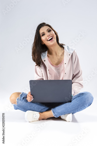 © danmorgan12, Naklejka premium Positive Caucasian Brunette Girl Working with Laptop While Seating on Floor with Legs Crossed. Posing in Hoodie and Blue Jeans Against White Background.