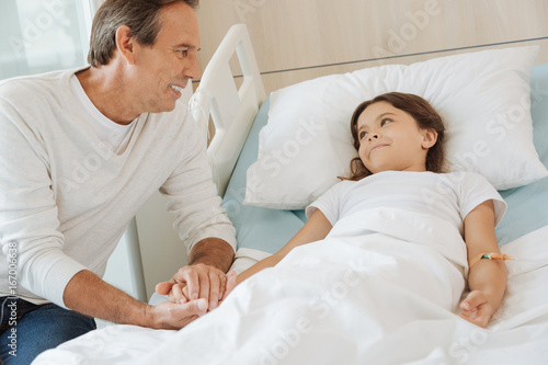 © zinkevych, Fototapeta premium Positive cheerful girl looking at her father
