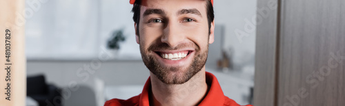 Obraz premium Positive delivery man looking at camera in hallway, banner.