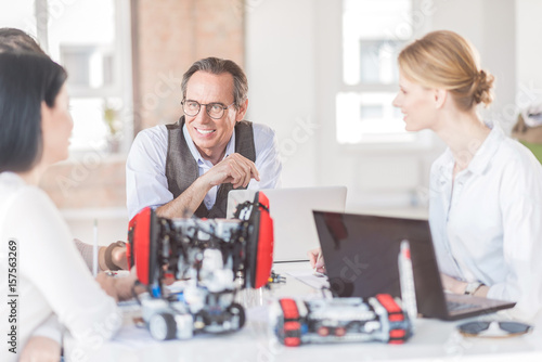 Obraz premium Positive engineers creating robot in office