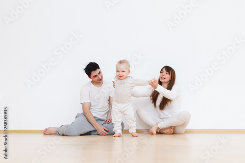 © Rithor, Naklejka premium Positive family portrait with mom,dad and little baby boy standing on white wall background. Parents hold by hand their child and help him do his first step. Generation concept