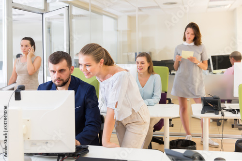 Obraz premium Positive girl helping male colleague in work