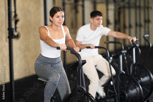 © JackF, Obraz premium Positive girl riding exercise bike for cardio workout during cycling class at modern crossfit gym