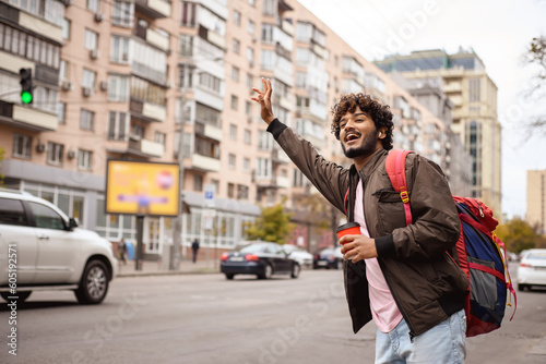Fototapeta premium Positive indian backpacker holding coffee and catching taxi on road in city