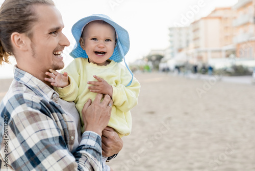 Fototapeta premium Positive man holding baby girl in panama hat on beach in Treviso.