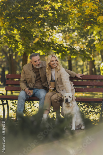 © LIGHTFIELD STUDIOS, Obraz premium Positive mature couple holding takeaway coffee while sitting on bench near labrador in park.