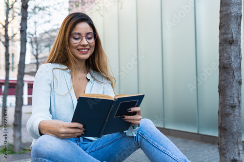 Fototapeta premium Positive optimistic brunette woman with glasses smiling while reading book outdoors. Student concept