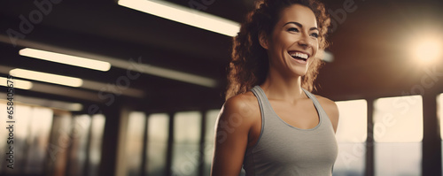 Fototapeta premium Positive pretty girl with an athletic figure in gym. Healthy lifestyle and fitness concept. Copy space