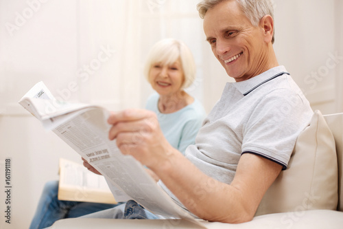 Obraz premium Positive productive couple enjoying informative morning together