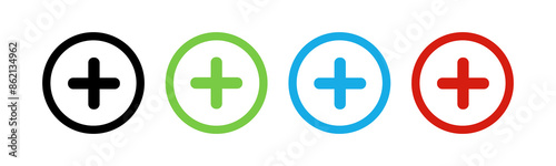 Obraz premium Positive round, buttons plus, cross illustration, addition vector icon illustration, symbol graphic internet, app, art, aid, computer, web. Color elements isolated