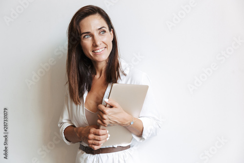 © Drobot Dean, Fototapeta premium Positive smiling young business woman at workplace indoors over white wall holding laptop.