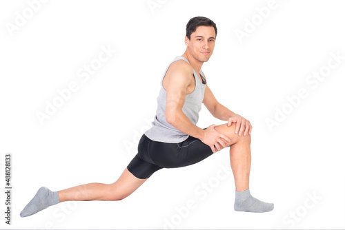 © Iván Moreno, Fototapeta premium Positive sportsman doing stretching exercise in studio