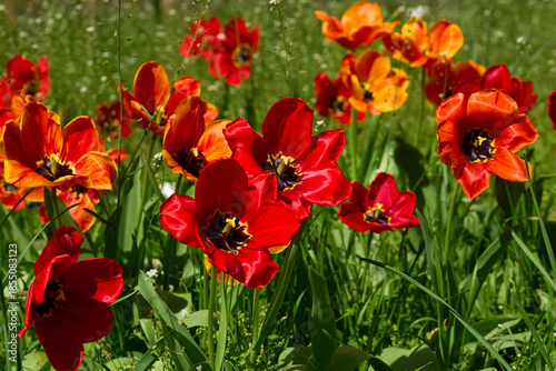 Fototapeta premium Positive spring.Opened head of a red tulip with stamens on lawn