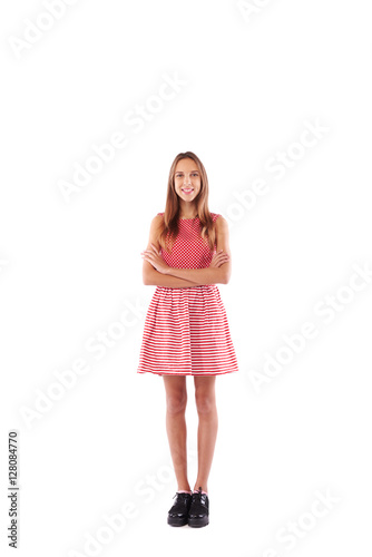 © ArtFamily, Fototapeta premium Positive teenager with arms folded on chest over white studio ba