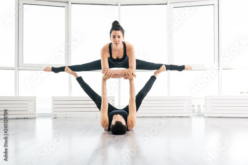 © gilitukha, Obraz premium Positive woman practice acro yoga with man partner at studio