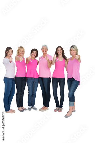 Fototapeta premium Positive women posing with pink top for breast cancer