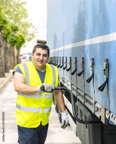 © ciprian, Fototapeta premium Positive worker connecting trailer with tractor truck