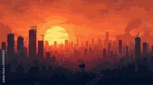 Fototapeta premium Post-apocalyptic city skyline silhouette at sunset panoramic view with tall...