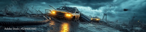 © Alexey, Obraz premium Post-apocalyptic City with Car Wreckage and Debris. Generative AI