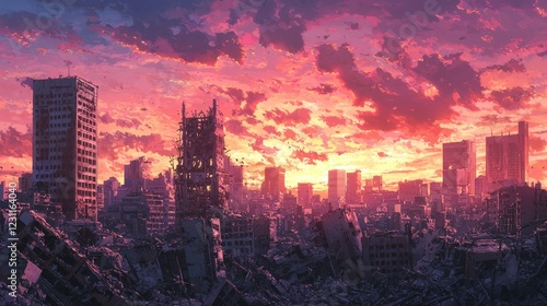 © Kitta Studio, Fototapeta premium Post-Apocalyptic Cityscape at Sunset with Dramatic Sky Colors