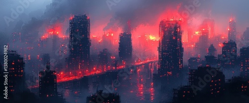 Naklejka premium Post-apocalyptic cityscape in fiery mist