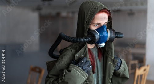 © Andrii Lysenko, Naklejka premium Post apocalyptic concept. Woman in gas mask in abandoned building.