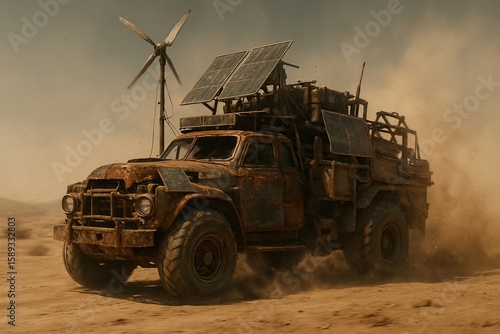 © Troy, Fototapeta premium Post apocalyptic scavenger truck with solar panels driving in the desert