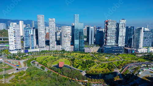Obraz premium Postcard of Mexico City's financial district, Santa Fe, with its dozens of corporate buildings and its La Mexicana park, green areas that coexist with modernity.