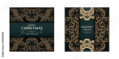 Fototapeta premium Postcard template Merry christmas in dark green color with luxurious yellow ornament