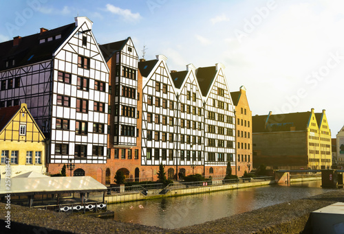 Obraz premium Postcard View of Gdansk, Poland over the river at sunset