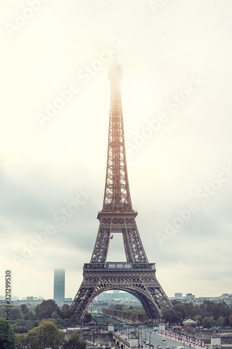 © Kseniia, Fototapeta premium Postcard with a view of the Eiffel Tower in the fog