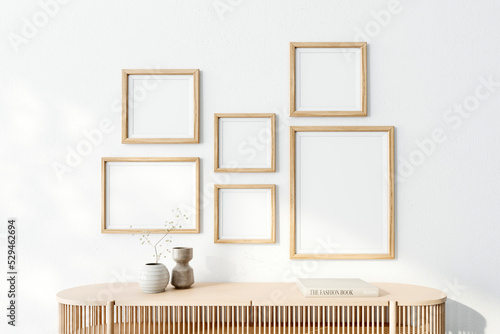 © Stephen, Naklejka premium Poster arts mockup with wooden frames on white wall. 3d rendering, illustration