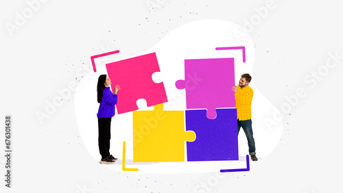 Fototapeta premium Poster. Contemporary art collage. Man and woman, colleagues combine pieces of puzzles to have new whole picture.