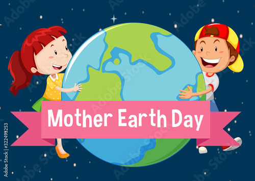 Fototapeta premium Poster design for mother earth day with two kids hugging it