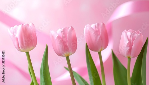 © Sholeh, Fototapeta premium Poster Featuring Pink Tulips, Subtle Pink Ribbon, Gentle, Hopeful Tone