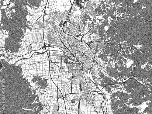 Naklejka premium Poster-ready black and white illustration map of Morioka, Japan, detailed and...